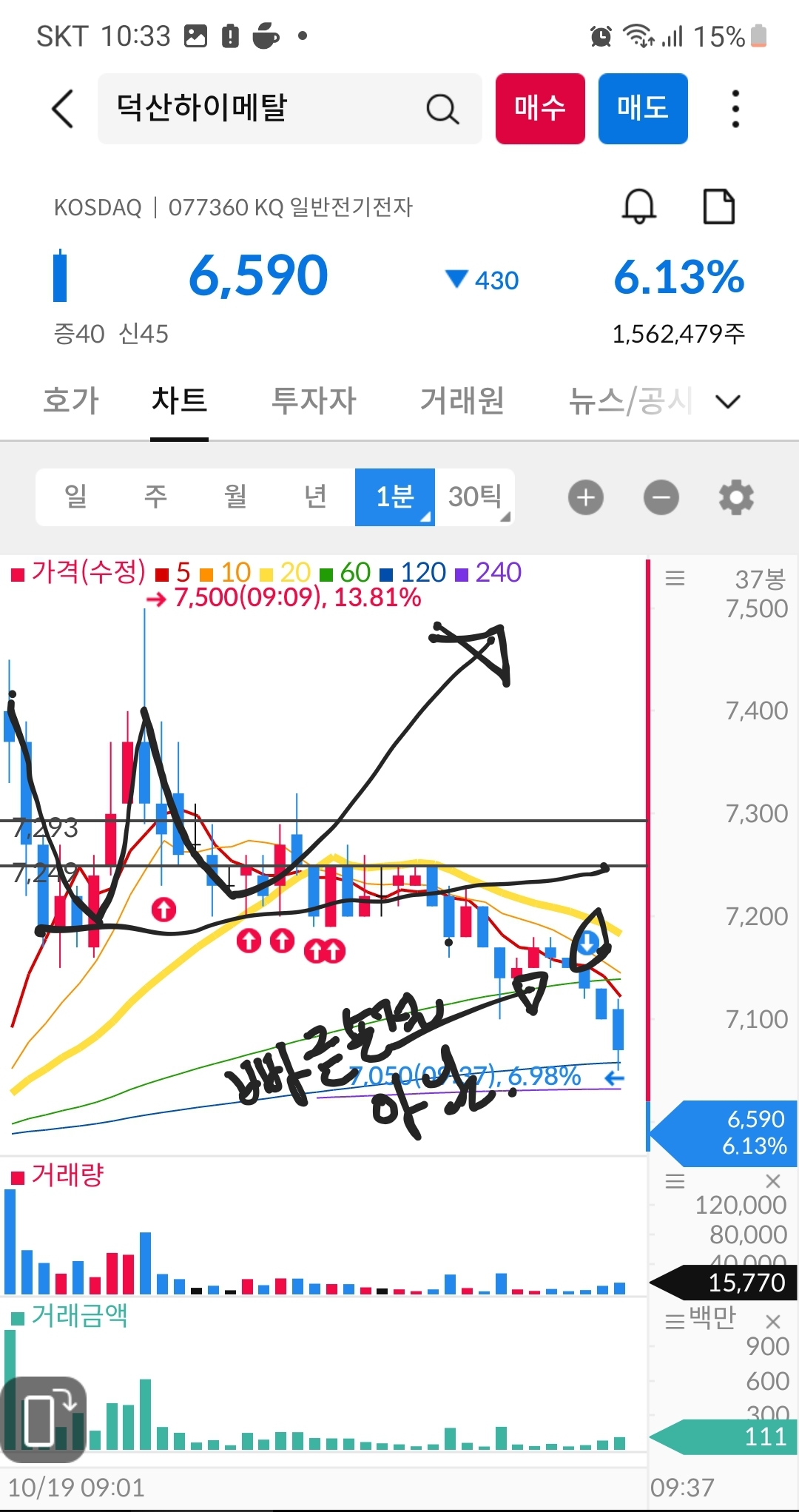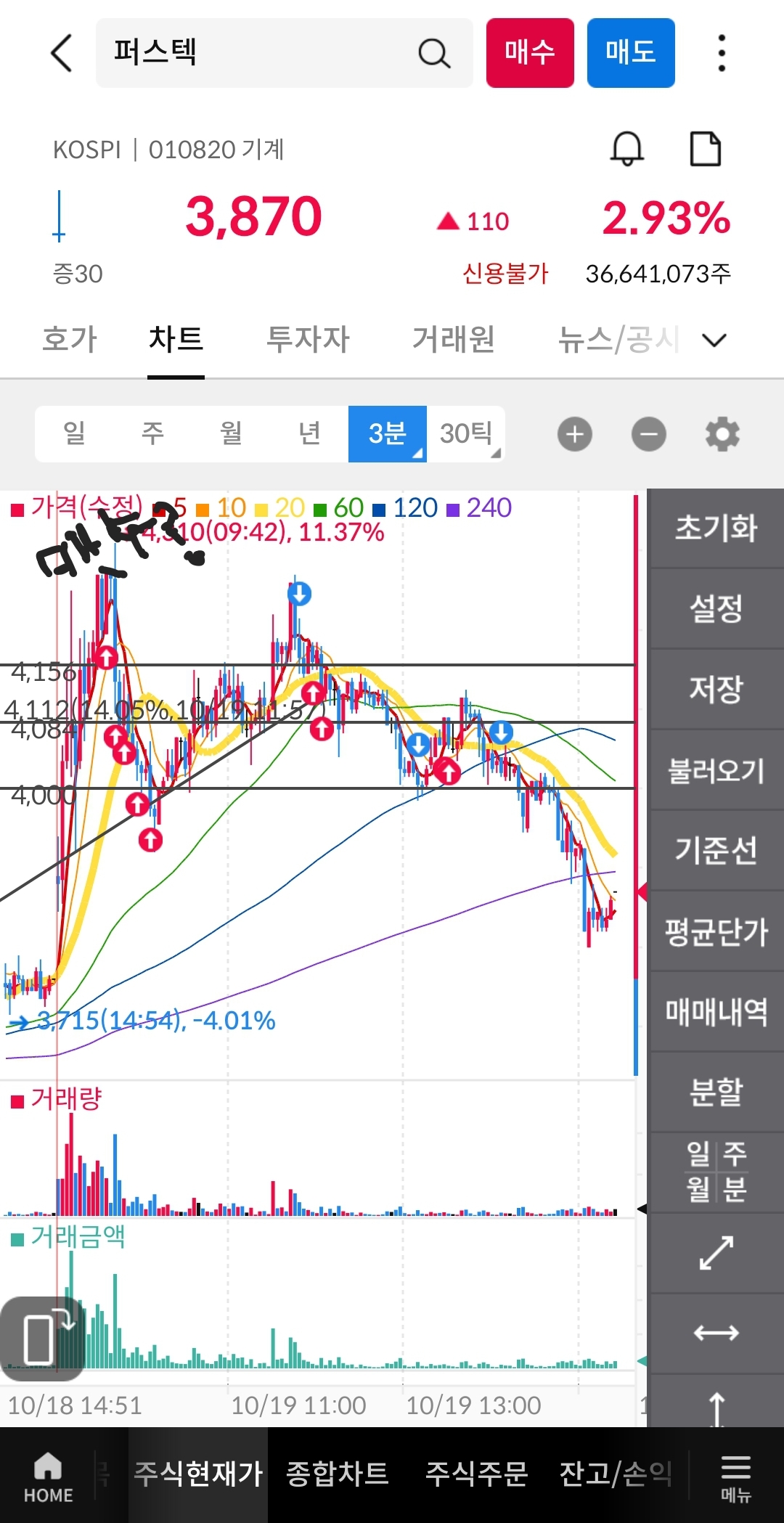 나의 오늘의 주매매였다. 덕산 손절하고 같은 드론관련주 검색하다가 이게 VI걸리는 모습에 따라 들어갔다. 결국 고점에 잡은거였다. 다행히 일부 매수라 1차 매수라인에서 매수...그리고 2차 매수라인 안왔는데,,,내혼자 1차에서 더 많이사서 평균이 높앗다. 그리고 결국 2차매수라인까지 와서 조금 매수....다행히 본전까지 왔지만 이렇게까지 올라오면 더 올라갈거라는 기대감에 기다리다가 결국 큰손절 나감...내꺼까지 왔다가 되돌아와서 내려가면 빠르게 약손절해야한다. 잊지마라.